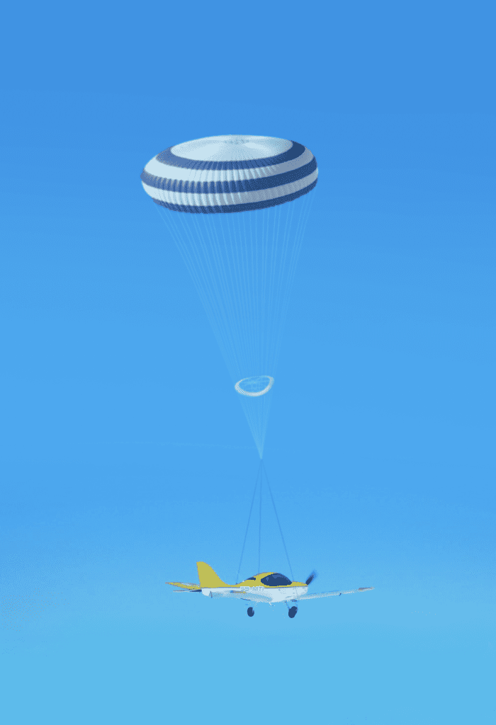 A: 1. Rocket fires. The chute is extracted 2. Speed-sensing slider controls how fast chute opens 3. Full parachute inflation 4. Aircraft is gradually lowered to the ground.